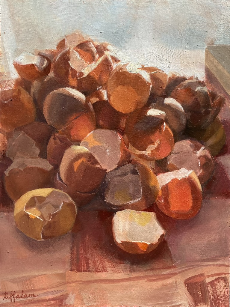 The eggshells accumulated, filling the space like a materialization of the time passed. One day, the morning light fell on the magnificent pyramid of empty shells, and I knew it was the end of the series — one last egg study to capture the final moments before they vanished.